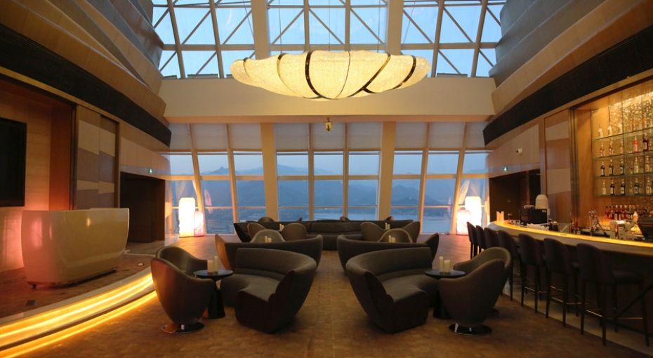 充满活力的魅力空间,冲击你的视觉 , 位于 21 楼的酒吧可以饱览雁栖湖和山区美不胜收的景色。独 特的内部设计配以玻璃墙和天花吊板,独立的威士忌酒吧和封闭的私密酒柜,各式选择宠坏客人的 味蕾 :从新鲜配制的鸡尾酒或一杯最好的葡萄酒到北京种类最齐全的麦芽威士忌,多种多样的顶级 威士忌、葡萄酒、香槟、白兰地、轻松休闲的鸡尾酒和古巴雪茄 ; 同时设有怡景餐厅,提供精致的 当地特色怀柔菜。